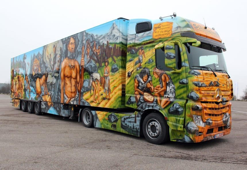 7 semaines et 35 litres de peintures ont été nécessaires pour réaliser cette œuvre baptisée Berceau de l’humanité. Le camion propriété des transports Josef Schumacher a été présenté dernièrement au carnaval d’Aix-la-Chapelle, en Allemagne. Une véritable Histoire de vie à quatre roues ! C’est le peintre aérographe Walter Rosner qui en est l’auteur.