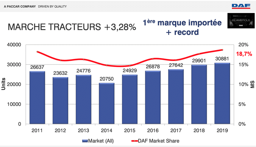 Ce chiffre reflète les succès obtenus sur l’ensemble des gammes, mais surtout en tracteurs routiers (XF et CF). Avec près de 19 % de part de marché en 2019 (18,7 %), les ventes du constructeur d’Eindhoven ont progressé de 3,28 % par rapport à 2018. Daf Trucks France rafle ainsi pour la seconde année consécutive la première place du podium des importateurs de tracteurs routiers.