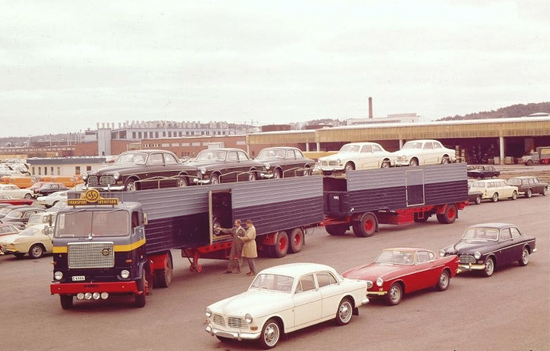 Petite séquence nostalgie, avec quelques ensembles de grande longueur. Des trains doubles composés, selon les cas, de deux semi-remorques et d’un dolly ou d’une semi-remorque et d’une remorque. Avec, pour commencer, un modèle suédois de 1966. Un porte-voitures, de 24 m de long, venu charger des Volvo Amazon et quelques coupés P1800 à l’usine de […]
