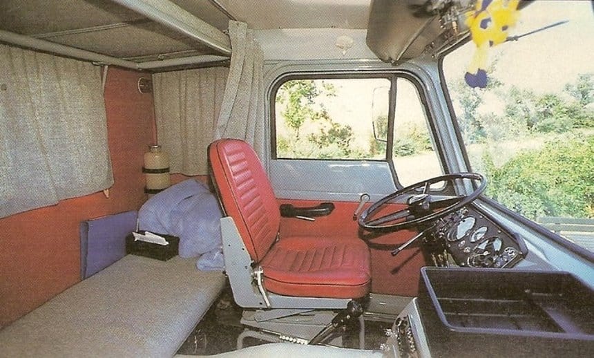 On voit tout de suite que l’on n’est pas dans l’actualité, ce poste de conduite est manifestement ancien : la couchette est étroite, la position du volant proche de l’horizontal, les garnissages sont comptés, les pare-soleil assez chiches et le tunnel moteur très présent. En revanche, le siège conducteur est suspendu, le tableau de bord […]