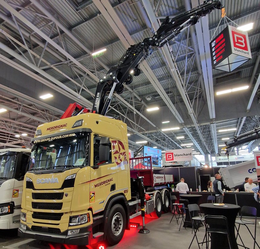 Dans le hall du parc expo de Nantes, impossible de ne pas remarquer la gigantesque grue Hiab X-Hipro 638 déployée jusqu’au plafond, sur le stand de Blanchard. Elle équipe un Scania 560 R double genre de couleur jaune qui attire l’œil des visiteurs lui aussi. « Nous équipons des poids lourds de grues de marque […]