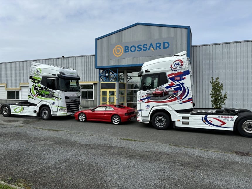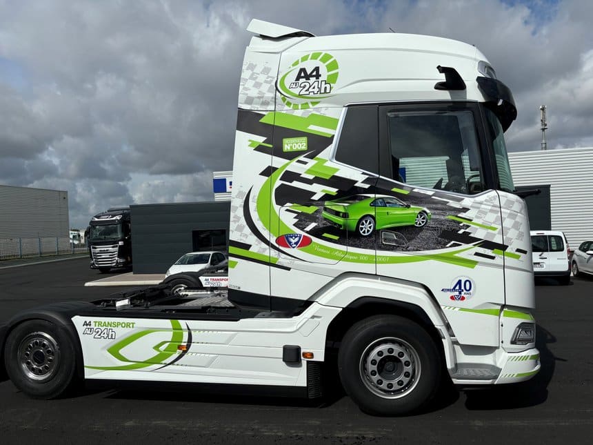 Covering racing. Le covering est confié à Alpha Pub à Cholet, qui conçoit, sur la base d’un blanc nacré d’usine, cette déco racing et colorée intégrant les photos de la voiture de sport sur les côtés, des adhésifs graphiques de couleur rouge Venturi et bleu sur un des camions, vert A4 Transports et bleu sur l’autre.