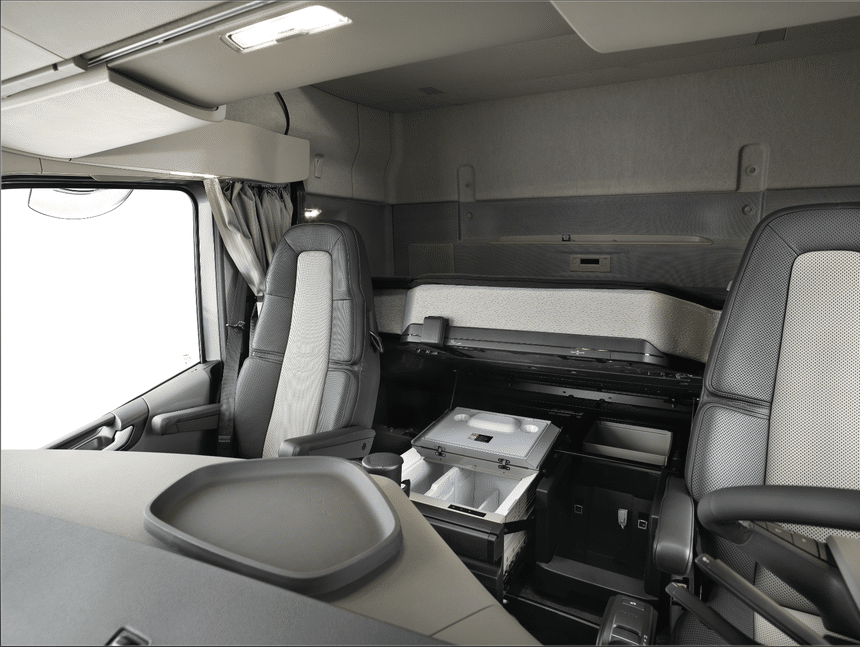 Considérablement plus longue, cette nouvelle cabine XXL a été conçue comme une deuxième maison pour les conducteurs. Celle-ci affiche ainsi 600 litres de plus que la cabine FH XL (qui était déjà spacieuse), offrant aux conducteurs davantage d’espace pour se reposer. Elle est également équipée d’une plus grande couchette et dispose d’un grand volume de rangement supplémentaire facilement accessible. L’habitacle est conçu pour être à la fois polyvalent et pratique. Avec un volume de rangement de 50 litres supplémentaires dans chaque compartiment sous la couchette, les conducteurs peuvent emporter beaucoup plus d’effets personnels sur les longs trajets.