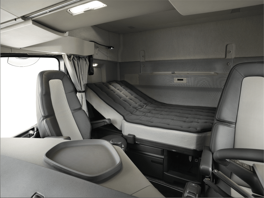 Pour garantir une bonne nuit de sommeil, le constructeur suédois a équipé le FH XXL de l’une des couchettes les plus spacieuses du marché. Elle a été allongée de 13 cm, pour atteindre 213 cm, et élargie de 25 cm, par rapport à celle de la cabine FH standard. Elle offre également au conducteur un dégagement plus important au-dessus de la tête et plus d’espace pour se détendre. Par ailleurs, le nouveau matelas intègre la technologie S-Touch, avec un garnissage en mousse de polyester sur chaque ressort pour un confort optimisé. À noter que la couchette inférieure est également disponible avec une fonction inclinable, pour une flexibilité et un confort accrus.