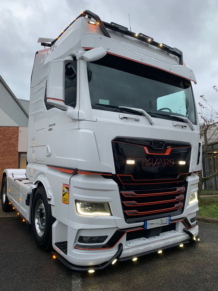Le transporteur a opté pour des tracteurs blancs, mais d’un blanc nacré du plus bel effet, d’autant qu’il est souligné d’équipements de couleur, notamment sur la calandre noire.