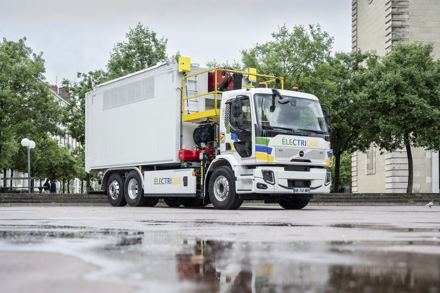 - Porteur Volvo FE Electric 6×2 avec essieu arrière directionnel ; benne de 32,5 m3 et grue en dos de cabine ;