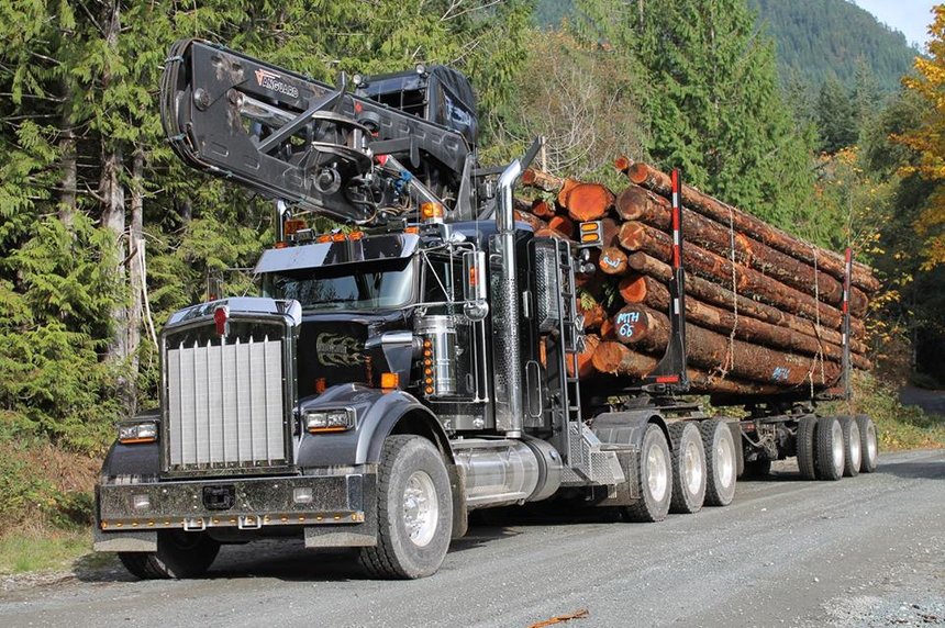 La scène se passe au Canada et le camion est Kenworth W900, mais elle ne se déroulerait pas différemment dans les Vosges, l’Oisans ou les Ardennes. Sauf qu’ici le tracteur est un 8×6 « tridrive », c’est-à-dire que ses trois essieux arrière sont moteurs. Ce qui permet de porter lourd, sans risques de perte de motricité, mais ne favorise pas la maniabilité et n’épargne, ni les pneus, ni les sols, dans les virages ou en manœuvre. Ce modèle est aussi équipé d’une grue embarquée, guère différente de celles que l’on utilise chez nous, ce qui lui permet d’être totalement autonome. Au retour, compte tenu de la hauteur du chargement, la grue a été tournée vers l’avant. Ce qui est tout de même plus facile à gérer avec une cabine à capot, puisque la flèche reste dans le gabarit du camion.