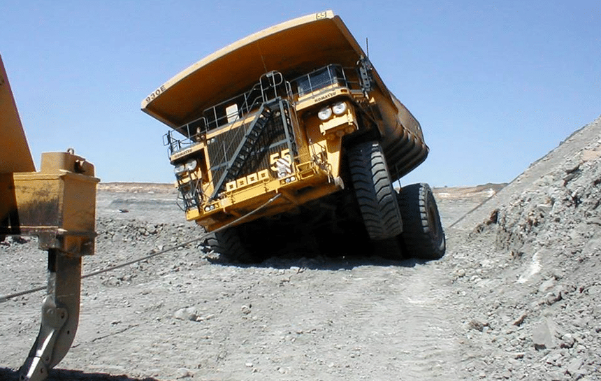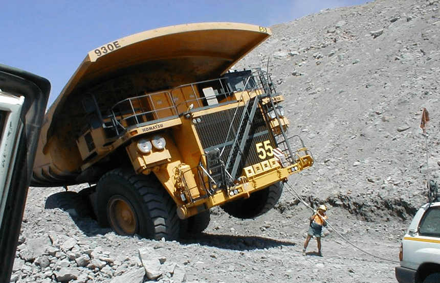 Surpris par un affaissement de chaussée ? Tombé dans un nid-de-poule géant ? Toujours est-il que ce colossal dumper minier, un Komatsu 930E, a salement perdu de sa superbe quand il s’est retrouvé d’un coup, « sur le cul », une roue en l’air, incapable de se tirer seul de ce mauvais pas. Heureusement, il paraissait alors rouler à vide. Parce qu’à plus de 500 t à pleine charge, le 930E n’est pas un client facile à dépanner.