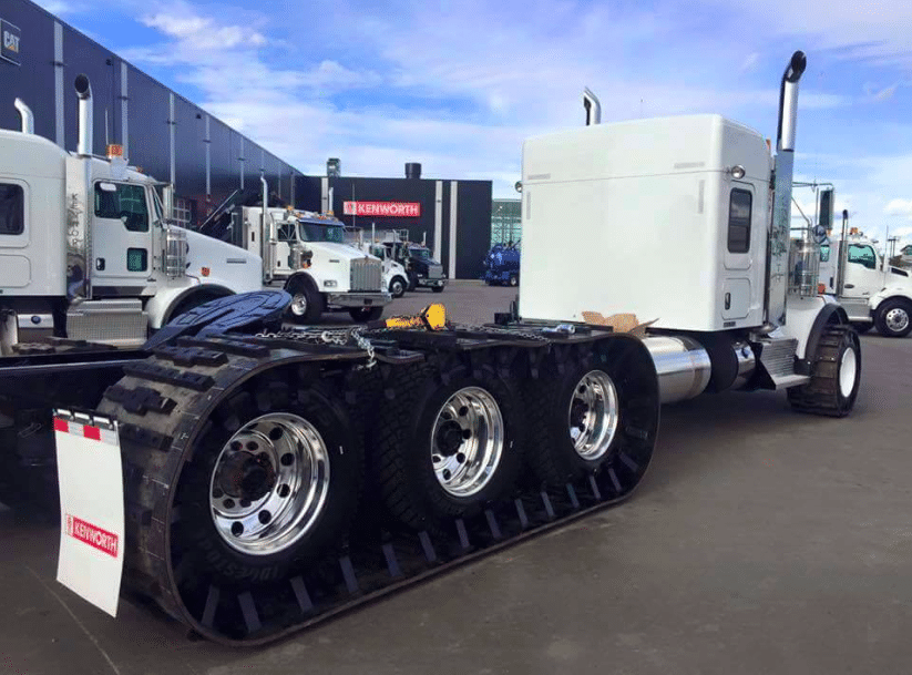 Ces difficultés ont évidement inspiré les inventeurs de tous poils. Leurs idées valent ce qu’elles valent, mais ne manquent parfois pas de pertinence. Ainsi, sachant que sur ces terrains boueux les engins à chenilles sont souvent les derniers à pouvoir passer, certains ont cherché à tirer un meilleur profit de la motricité des camions à essieux tandem ou tridem entraînés, en leur conférant, temporairement, les qualités d’adhérence d’un engin chenillé. Et voilà le résultat : des chenilles souples et amovibles qui se montent, à la mauvaise saison, pour pouvoir continuer à évoluer sur des terres détrempées et instables, avec le bénéficie d’une moindre pression au sol et d’un moindre effet de poinçonnement des essieux.