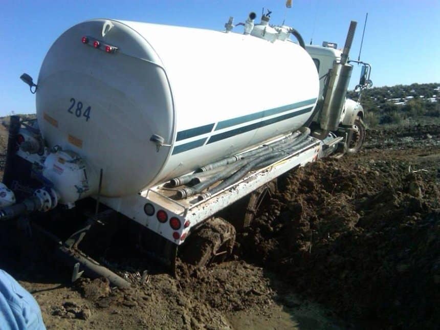 Comme le conducteur de ce vacuum truck, un camion citerne servant à collecter les déchets liquides (qui ne manquent pas dans ces industries-là). Il disposait pourtant du bon châssis, un Mack GU 8×6 tridrive dont les trois essieux arrière moteurs sont la garantie d’une motricité maximale – à défaut d’une maniabilité exemplaire. Il avait également bien anticipé le coup en équipant de chaînes tous les jumelages arrière. Mais ça n’a manifestement pas suffi et sans le secours d’un autre camion ou d’un bull pour le tirer de là, il ne s’en sortira jamais.