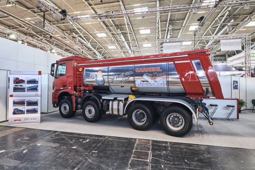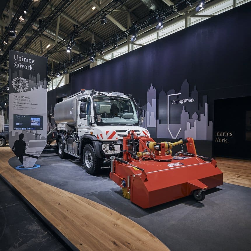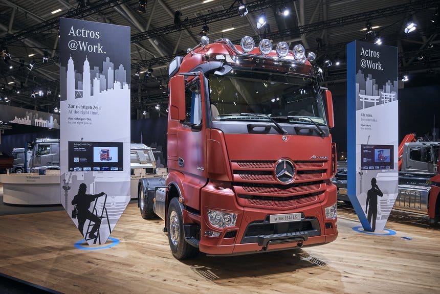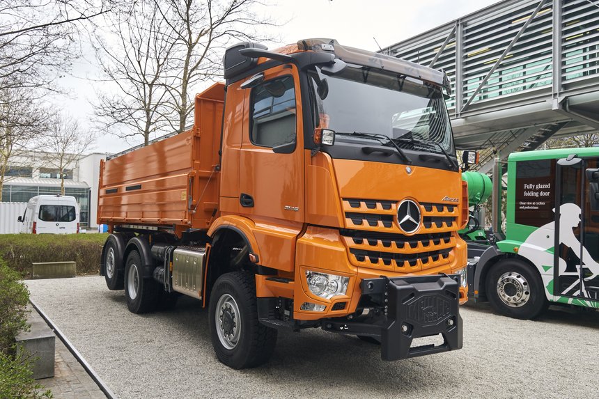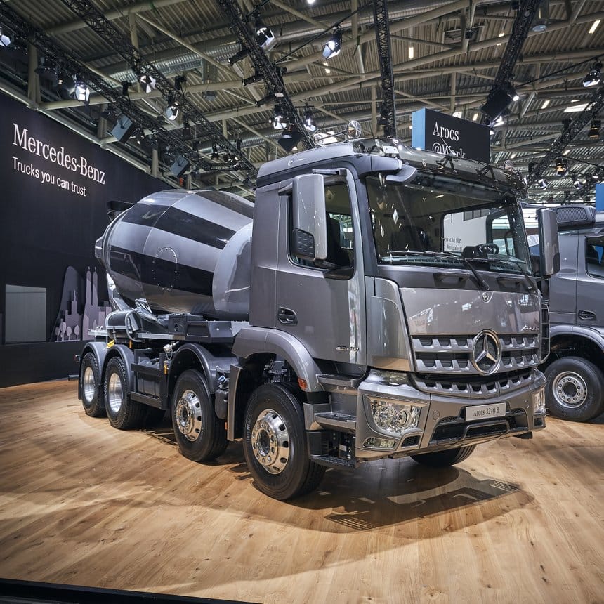 On a également aperçu sur les stands des partenaires carrossiers du groupe Daimler, plusieurs réalisations sur base Arocs et Actros (toupies, pompes à béton, bennes basculantes, aspirateurs). Selon Mercedes, cela confirme l’attractivité de sa gamme porteurs « en particulier sur les gammes lourdes avec la première place du segment des + de 26t depuis le début de l’année ».