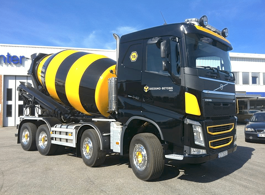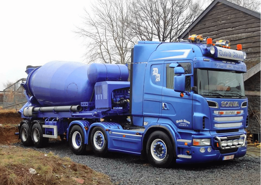 Livrer du béton avec classe, ça change tout. Nos voisins belges nous en font la démonstration, avec ces quelques véhicules associant grande capacité – toupie sur semi-remorque – et belle présentation. Au programme, tracteurs 6×2 et 6×4, de marques Volvo et Scania, plus, à l’arrière plan de la photo d’ouverture, un Volvo FM équipé d’une pompe à béton alimentée par un Renault Premium Lander tracteur 6×4.
