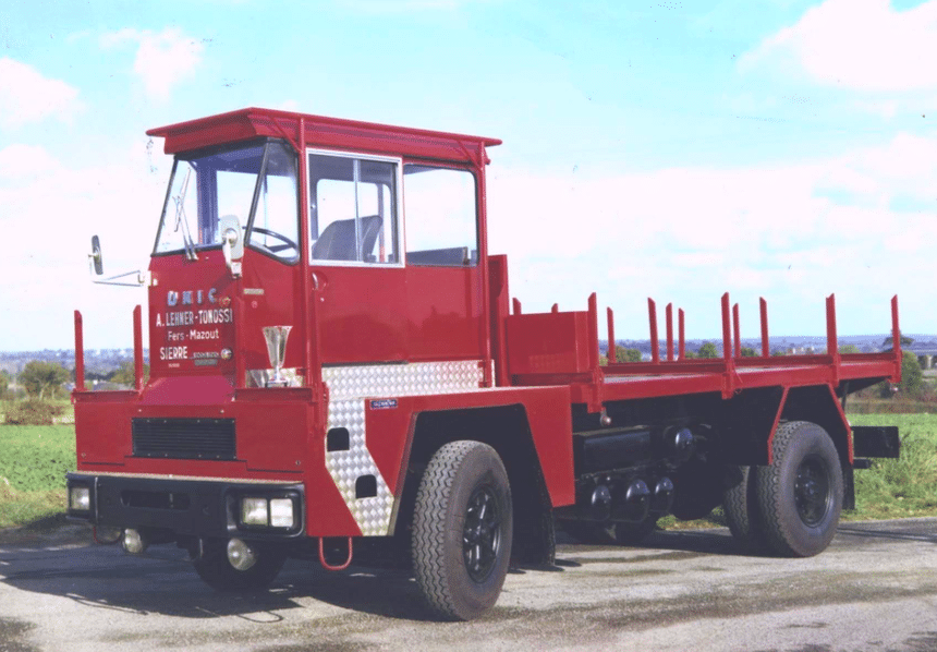Et puis, ci-dessous, un petit rappel historique, avec des images de porte-fers Pelpel à cabine centrale, ici réalisés sur des châssis Unic P 200 et P 340. Des camions livrés en Suisse, en 1970 et 1972, par le Garage Kurve, importateur de la marque jusqu’en 1974. A noter que leur largeur avait été ramenée de 2,50 m à 2,30 m afin de leur permettre de circuler sur l’ensemble du réseau routier suisse, dont une partie était alors interdite aux véhicules de plus de 2,30 m. Sur ces modèles à conduite centrale, le carrossier devait déplacer les commandes (direction, pédales…) à l’exception du levier de boîte de vitesses qui se retrouvait alors à main gauche du conducteur.
