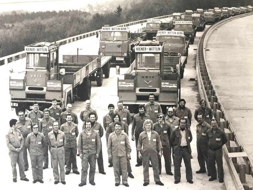 Cette superbe photo de Kiener + Wittlin montre, derrière les chauffeurs de l’entreprise, un parc d’une vingtaine de camions, avec les deux Unic-Pelpel en tête, suivis de tracteurs et porteurs Volvo, Mercedes, Bedford et OM. Au 4ème rang, on aperçoit deux autres porte-fers à cabine centrale. Ce sont des Mowag de fabrication suisse. Leur cabine était positionnée plus bas que celle des Unic car leur moteur était disposé horizontalement, sous le châssis, dans l’empattement. Conséquence, l’accès au poste de conduite se faisait… par l’avant.