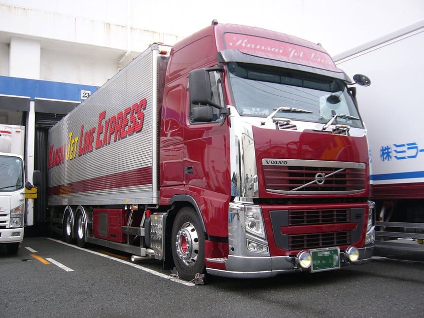Le premier est un tracteur Fuso FV, un grand routier de 400 ch et boîte automatisée à 12 rapports, et le second un Volvo FH à cabine Globetrotter. Un modèle de prestige au Japon, où les importations demeurent une exception. Il est ici utilisé dans une configuration porteur 6×2 solo qui est courante en longue distance où l’on trouve aussi de nombreux porteurs 8×2, souvent avec des pneus de plus petite dimension à l’arrière qu’à l’avant, afin d’abaisser le châssis et de dégager plus de volume utile. Son fourgon en alu est d’un usage très répandu, de même que la carrosserie de la semi du Fuso, plus déroutante toutefois : un mélange de fourgon et de plateau à ridelles… avec un groupe Thermo King !