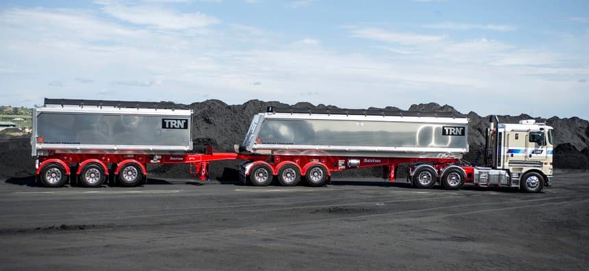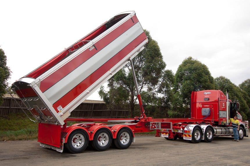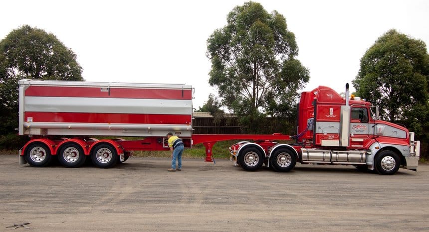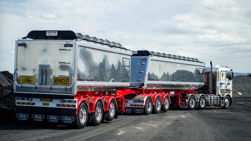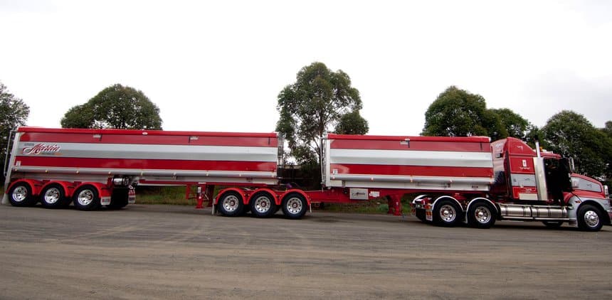 Une autre solution, plus simple et également proposée par Muscat Trailers, consiste à utiliser en queue de convoi une remorque semi-portée attelée par un long timon à une sellette encastrée sous la caisse de la semi-remorque de tête. Là, pas besoin de dételer pour opérer un bennage arrière de la première semi, il suffit de « casser » l’ensemble en mettant la remorque à angle droit. Un exercice auquel les conducteurs australiens excellent mais qui suppose d’avoir tout de même de la place pour manœuvrer. Et admirez toujours cette superbe finition, avec cette fois un Kenworth K200 à cabine avancée comme tracteur.