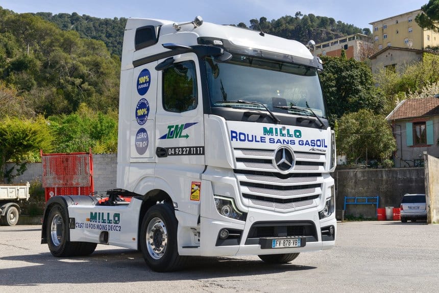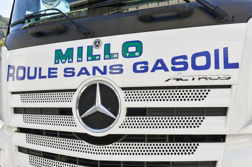 « C’est facile, les camions Mercedes sont déjà réglés pour cela. Aucune modification nécessaire, et il n’y a même aucune différence pour l’entretien ou la garantie! C’est ce qui m’a incité à sauter le pas », explique Pierre Millo, le patron des transports éponymes. Ce dernier est fier de son nouveau slogan qu’il apposé en grand sur la calandre de ses deux nouveaux Mercedes Actros 5.