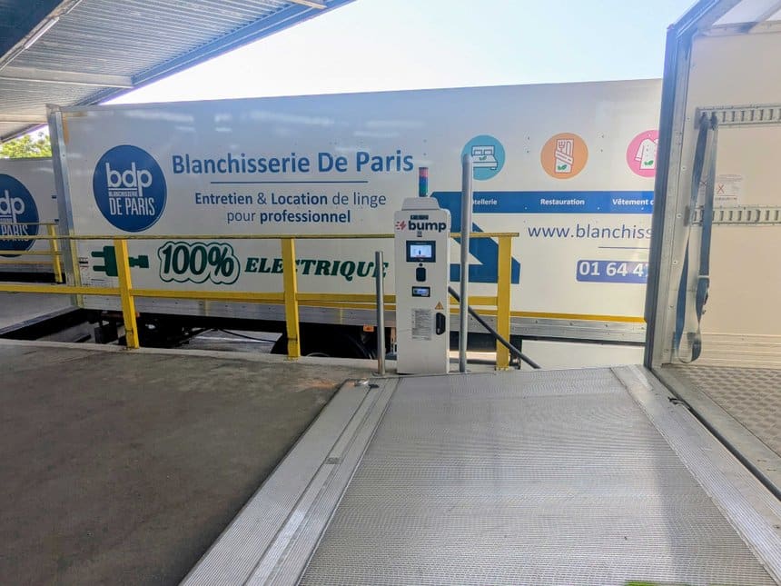 La Blanchisserie de Paris, qui souhaite maîtriser la recharge électrique de ces véhicules, a fait appel à Bump pour déployer des stations, ou bornes, directement sur son site de Chilly-Mazarin. Avec la volonté d’avoir des recharges rapides. Le site était peu propice à cela, avec des quais de chargement et peu d’espace pour installer la station nécessaire.