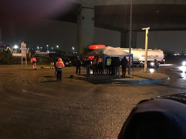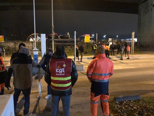 3h30 du matin devant les dépôts TotalEnergies de Gennevilliers (Hauts-de-Seine), Coignières (Yvelines) et Mitry-Mory (Seine-et-Marne), ce lundi 4 décembre. Le froid et la pluie n’empêchent pas les militants de la CGT Transports de distribuer des tracts aux routiers conduisant les ensembles citernes matières dangereuses pour le compte du géant pétrolier.