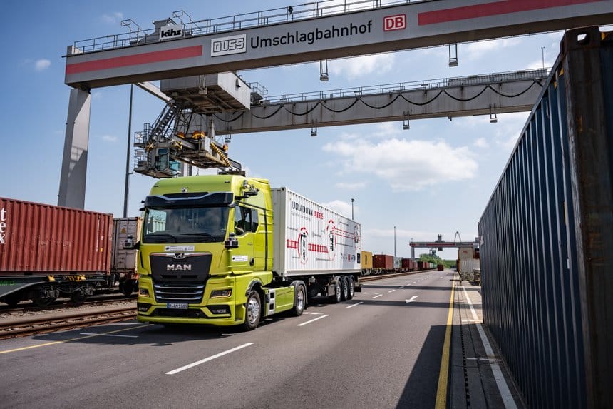 Camion autopiloté. Pour ce faire, MAN a mis au point un camion autopiloté qui gère de manière autonome le chargement des conteneurs de la route au rail à l’aide d’une planification numérique des missions. Après six mois d’essais pratiques menés conjointement avec les partenaires au dépôt de conteneurs de DB Intermodal Services et au terminal de conteneurs DUSS à Ulm, il est apparu clairement à la fin du projet en septembre 2023 que le camion autonome était jusqu’à 40 % plus productif que les véhicules conventionnels et qu’il représentait donc un grand atout pour rendre le transport de marchandises combiné route-rail respectueux de l’environnement plus efficace, plus prévisible et plus flexible.