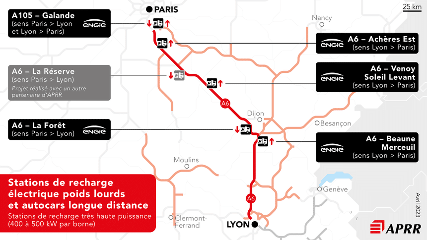Ce réseau concerne en premier lieu 6 points de ravitaillement en électricité pour les camions fonctionnant grâce à cette énergie, dont 5 sont le fruit du partenariat entre APRR et Engie.
