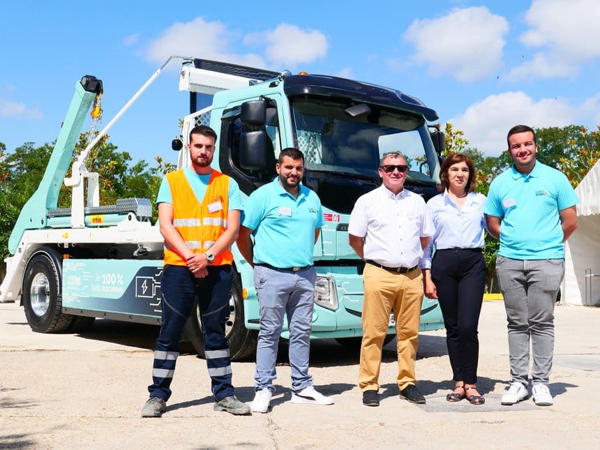 De gauche à droite : Le conducteur Kévin Martins, le directeur technique Pedro Chavez, les dirigeants Antonio et Silvina Rodrigues et leur fils Ivan, fêtent l’arrivée du Volvo FE Electrique chez Luxo Bennes, le 23 juin à Massy (Essonne). Photo : N. Grumel