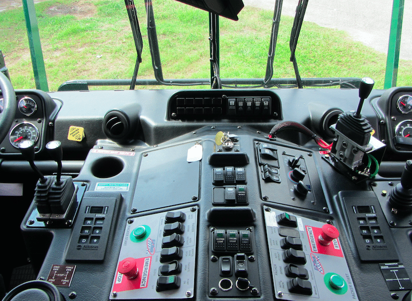 Notre cabine mystère était justement celle camion de ce genre, un Autocar à cabine avancée basse, spécialement conçu pour ces missions. Et s’il y a beaucoup de commandes à bord, c’est qu’il y a beaucoup d’éléments mobiles, tous commandés en cabine et par un seul opérateur.