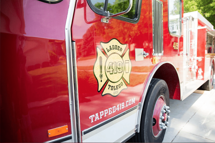 Ce E-One de 1987 a tout d’un « fire truck » américain; il s’agit pourtant d’un camion pompe… à bière. Cette idée originale a germé il y a quelques années chez Kevin Mullan, un entrepreneur originaire de Toledo dans l’Ohio aux États Unis, alors qu’il vivait à Dallas dans le Texas : « J’avais vu un camion de pompiers ancien avec un four à pizza au feu de bois et quelques tireuses à bière et je me suis dit qu’il y avait quelque chose à creuser, explique-t-il au Blade, le quotidien local de Toledo. En rentrant chez moi, j’ai parlé du concept de camion pompe à bière à louer à ma femme qui a tout de suite été emballée ».