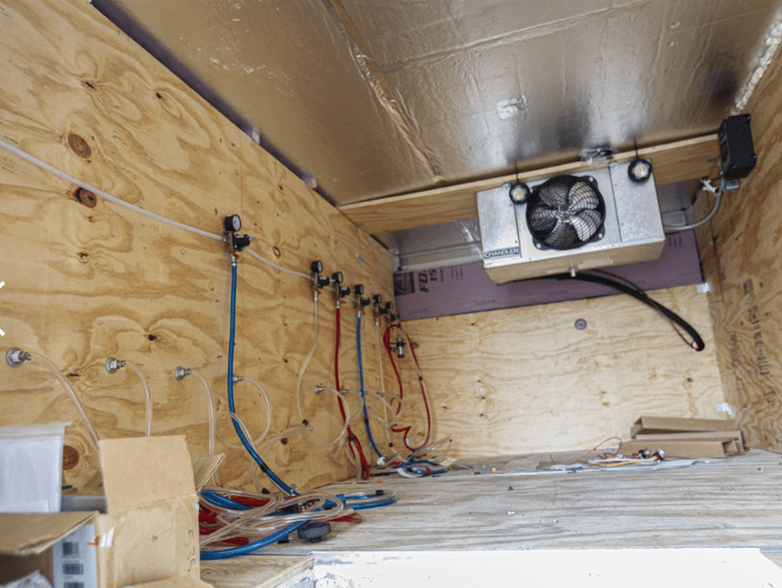 Une fois le camion arrivé à Toledo, Kevin l’inspecte et lance les travaux de modifications : « Il était étonnamment dans un bon état général, souligne-t-il. On a donc commencé par retirer le réservoir d’eau de 1 500 gallons (environ 6 m3). Le toit de la caisse arrière a été relevé pour pouvoir se tenir debout à l’intérieur. On a aussi installé une unité de réfrigération, tout l’équipement nécessaire pour opérer les 10 tireuses « . Le camion peut contenir une quinzaine de fûts de bière ou de soda. Malgré toutes ces transformations, l’aspect extérieur original du véhicule a été conservé, y compris les leviers, les jauges et les vannes dans la cabine.