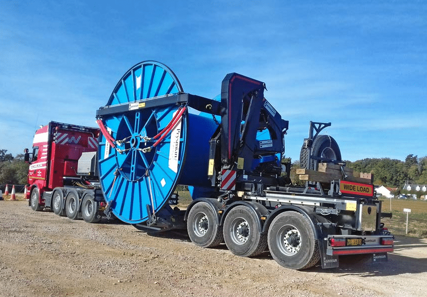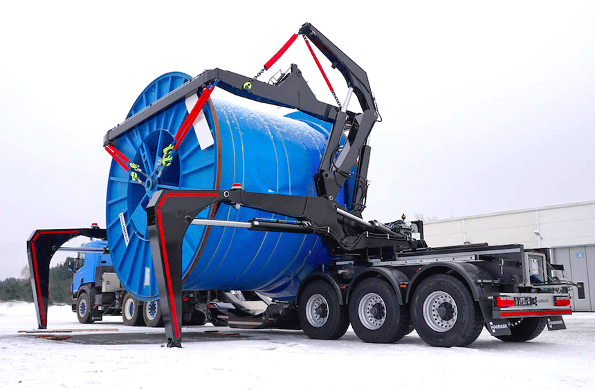 Hammar propose des semi-remorques auto-chargeuses capables de transporter des tourets jusqu’à 4,5 m de diamètre, 4 m de large et d’un poids de 36 t.