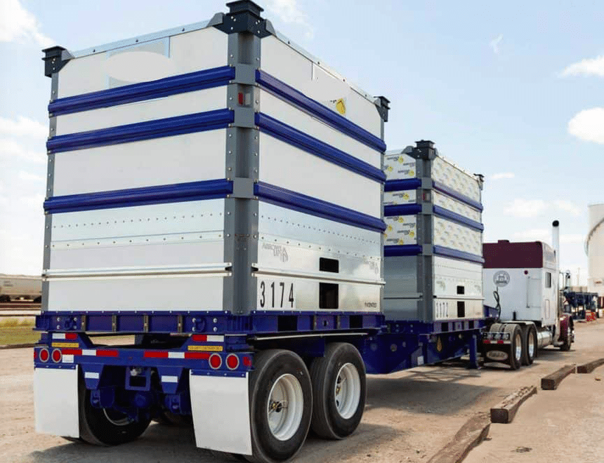 Une chose est sûre, ces conteneurs n’ont rien de maritime. Ils ne sont pas ISO mais peuvent être gerbés, ils ne sont pas bien grands mais semblent peser lourd. Que peut-on bien transporter dedans ? Réponse dans quelques jours…