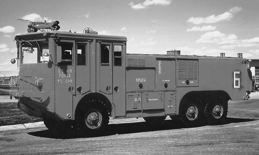 Cet intriguant poste de conduite, surchargé de compteurs et de manomètres, est celui d’un camion très particulier, conçu pour sauver des vies : c’est en effet celui d’un véhicule de secours American LaFrance type 0-10. Un modèle commandé à plus de mille exemplaires par l’US Air Force au début des années 1950, qui a connu le baptême du feu durant la guerre de Corée et qui sera déployé sur à peu près toutes les bases aériennes américaines à travers le monde.