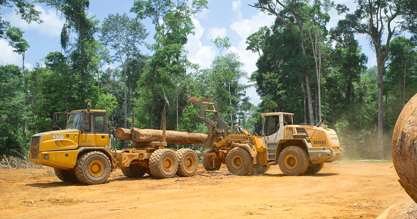 En Guyane, les conditions peuvent si difficiles que les exploitants forestiers utilisent parfois des dumpers articulés transformés en tracteurs grumiers, comme ce Bell B30D 6×6.