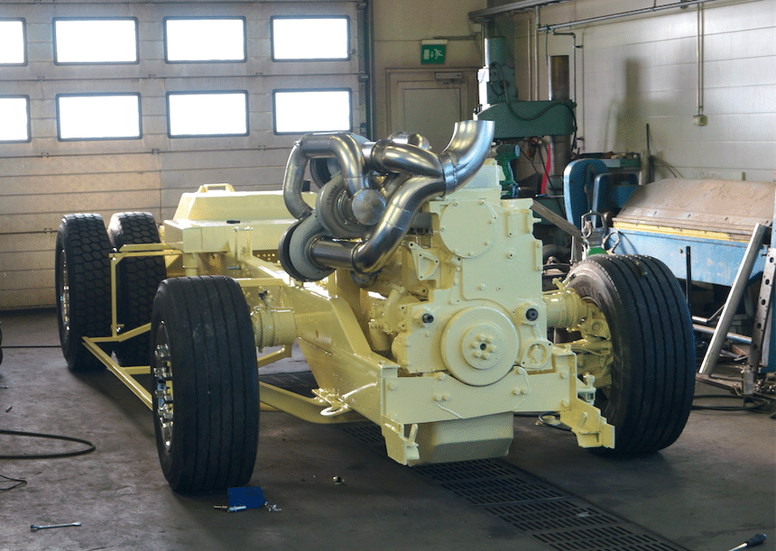 Le châssis est clairement celui d’un camion, mais pas d’un modèle récent. Quant au moteur, sa préparation sort manifestement des règles habituelles.