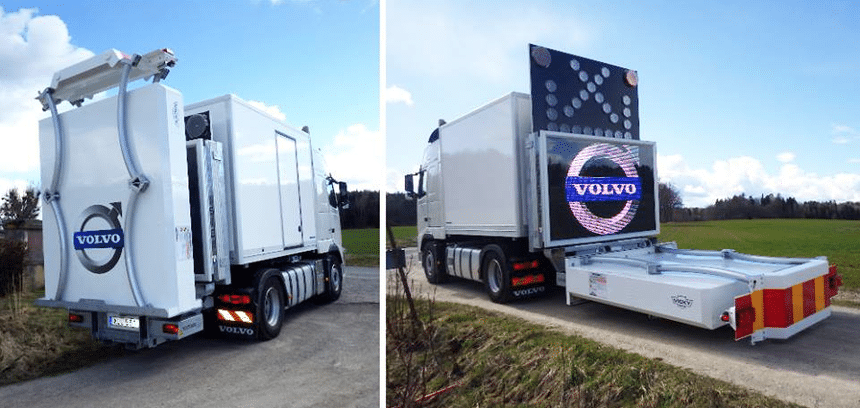 Si nos deux camions-mystères de la semaine dernière présentaient des allures de tracteurs, il ne faut pas s’en étonner. Car, à la base, il s’agit bien de tracteurs. Quant à la carrosserie ultra-compacte qui leur est associée, elle n’est pas destinée à transporter grand-chose, sinon un peu d’outillage ou d’équipement léger, l’important n’étant pas la caisse mais ce qui se trouve derrière et que l’on aperçoit vaguement sur les photos : une sorte de structure, relevée verticalement le long de la paroi arrière du fourgon. De quoi s’agit-il ? De ce que la terminologie anglo-américaine nomme TMA pour Truck Mounted Attenuator, c’est-à-dire atténuateur de choc monté sur camion. Ce type d’équipement est destiné à protéger les véhicules devant intervenir sur le réseau routier ou autoroutier pour signaler une zone de travaux temporaires ou mobiles, ou une opération de secours. À l’arrêt ou évoluant à faible vitesse, ils sont très exposés aux accidents et se trouvent régulièrement percutés par des conducteurs inattentifs. La structure TMA, alors déployée horizontalement derrière le camion, a pour rôle d’absorber l’énergie cinétique en cas de choc, protégeant ainsi le camion, les équipes au sol et les occupants du véhicule percuteur.