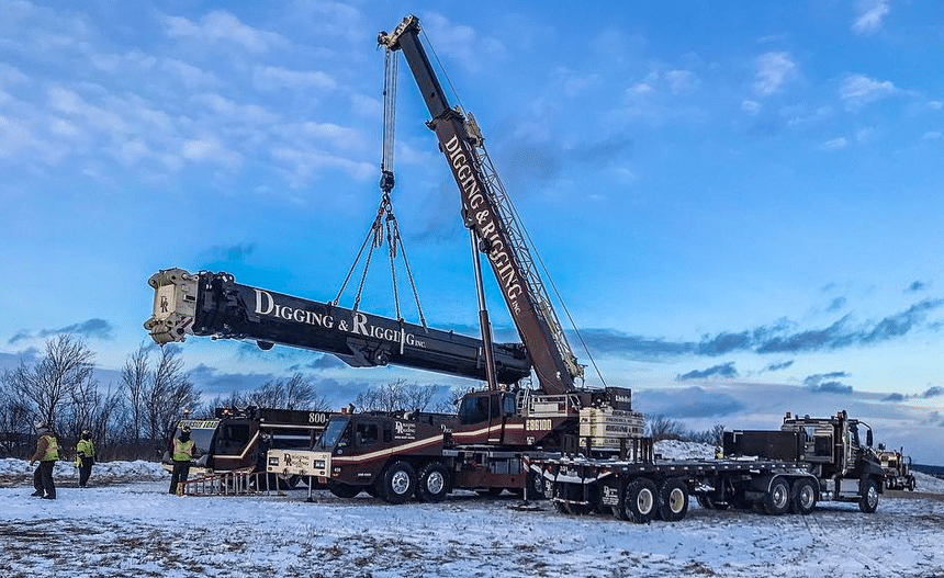 Reste que pour alléger encore la machine, il est possible de la déplacer sans sa flèche qui doit alors être remontée sur site. Comme on le voit ici où une grue Link-Belt de l’entreprise a été mobilisée pour l’opération.
