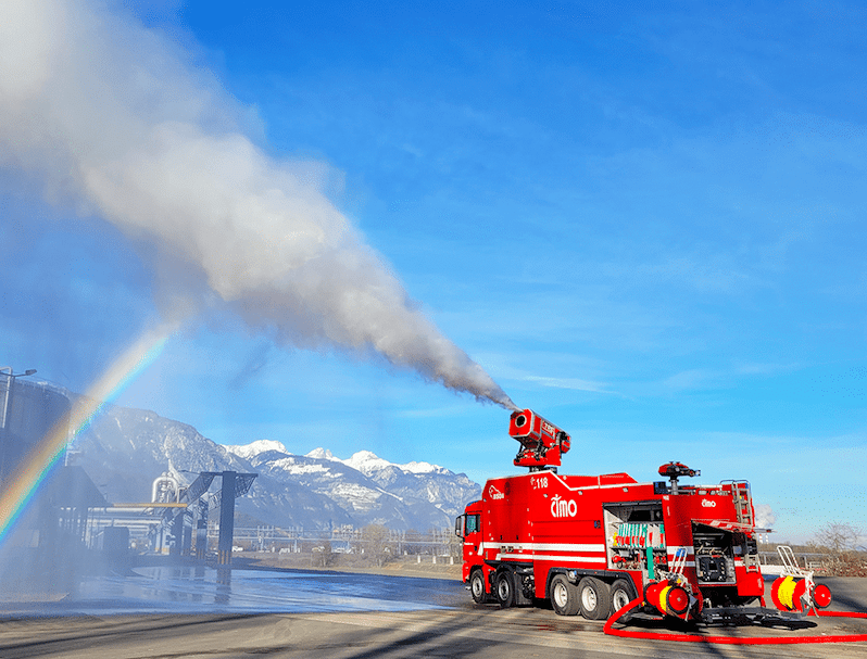 Oui, ce camion est un camion de pompier. Sa particularité est d’être équipé d’une turbine anti-incendie qui projette l’eau en très fines gouttelettes. Une nébulisation qui augmente l’efficacité car ces fines particules ont une grande capacité d’absorption de la chaleur et réduisent aussi les fumées. Un type d’autopompe fréquemment affecté à la protection des grands sites industriels.