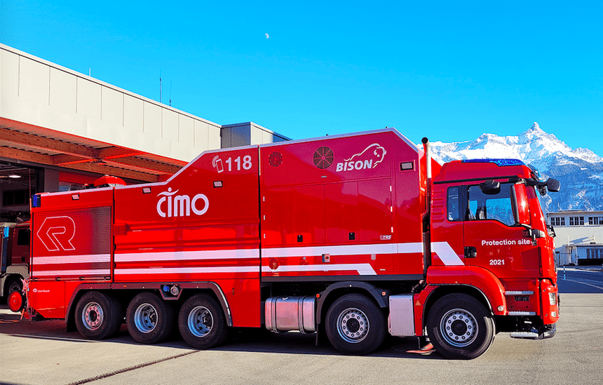 Ce qui est le cas de celui-ci, réalisé par l’équipementier autrichien Rosenbauer et livré l’an dernier à la Compagnie Industrielle de Monthey, en Suisse. Il porte 8 000 l d’eau et 3 000 l de mousse et sa turbine n’extinction a une puissance de 4 500 l/mn. Elle est escamotable et commandée depuis le poste de conduite. Du lourd donc, justifiant le recours à un porteur MAN TGS 35.510 BLL 10×4.