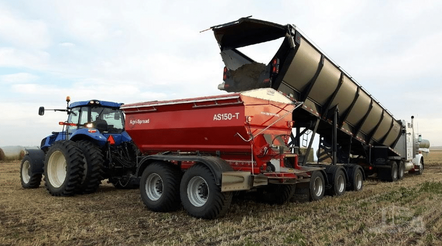 En effet, cette semi-remorque, conçue et fabriquée par Trout River, au Canada, est destinée (notamment) à approvisionner les épandeurs de produits fertilisants utilisés dans les grandes exploitations agricoles nord-américaines. Or, pour remplir leur trémie, la caisse de la semi doit pouvoir se positionner au-dessus. Ainsi, l’arrière de cette benne de 48’ (14,6 m) peut-il être levé jusqu’à une hauteur de 4,88 m. Largement suffisant alimenter les plus grosses remorques ou engins d’épandage.