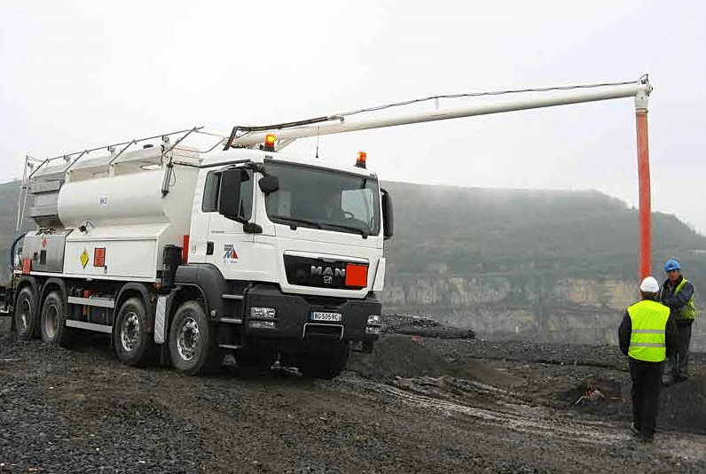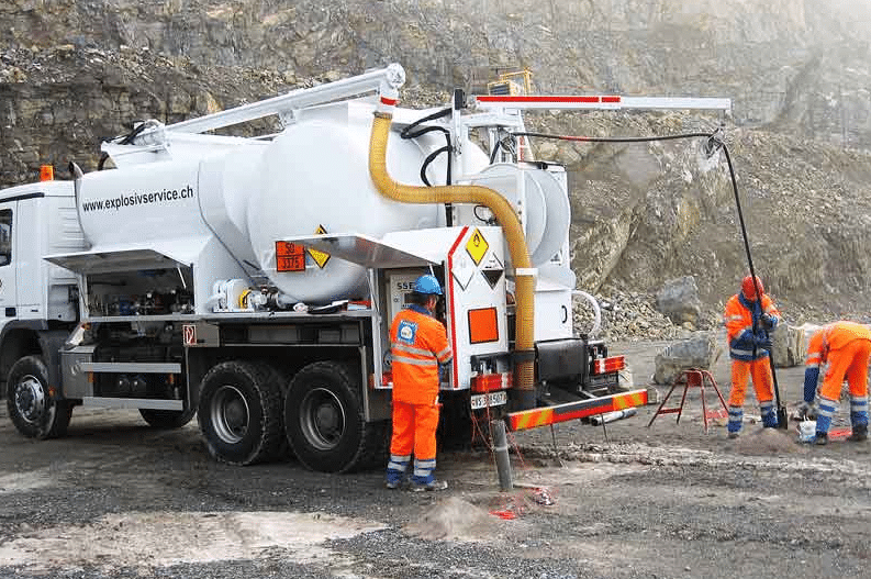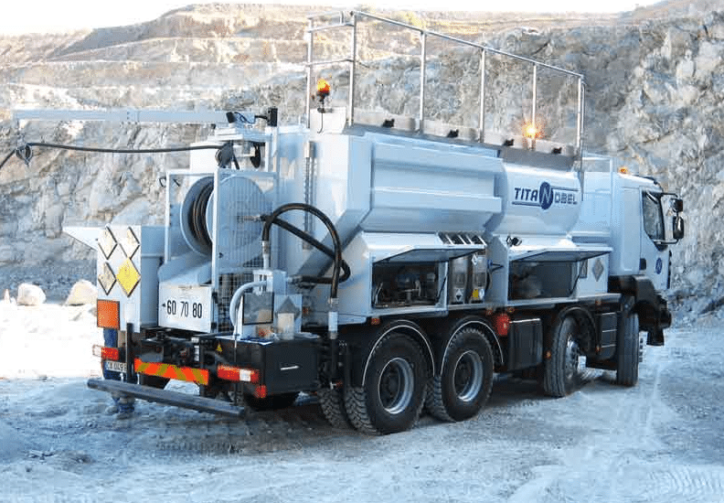 C’est peu dire qu’il s’agit là d’un travail de spécialistes. Leur outil de base est ce type de camion qui permet de fabriquer, sur site, différents types d’explosif (émulsion explosive, nitrate-fioul ou autre). Ce qui évite le transport sur la voie publique de matières classées 1.1.D, les plus dangereuses, car présentant un risque d’explosion en masse (comme le TNT par exemple).