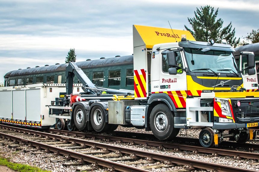 Comprenez par là que ce camion est conçu et équipé de manière à pouvoir circuler indifféremment sur route ou sur rail. Dans ce cas précis, il s’agit de l’un des quatre Volvo FM330 6×2 mis en service par la société hollandaise Pro Rail en 2016. Ces camions sont utilisés pour des missions de secours sur le réseau ferré. Dotés d’un bras hydraulique, ils peuvent saisir et déposer diverses carrosseries équipées en fonction des différents types d’intervention à effectuer.