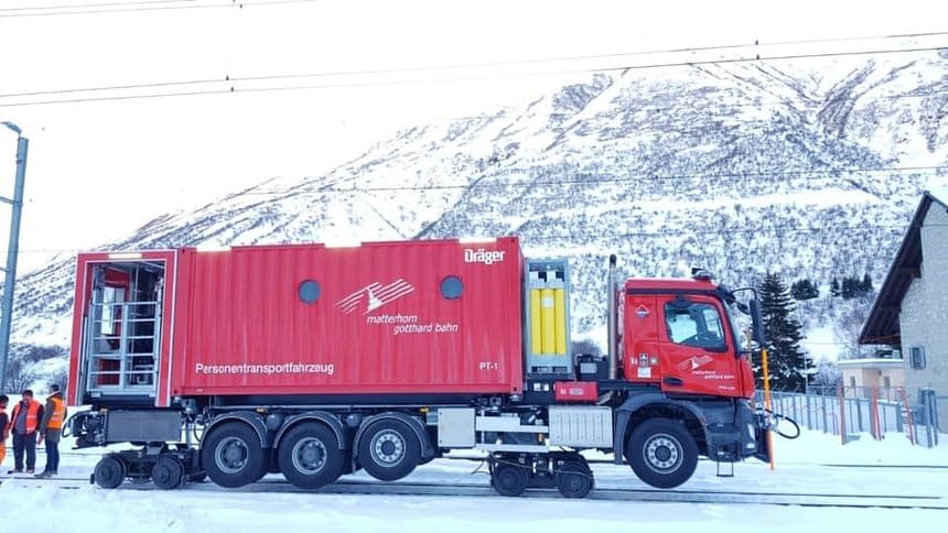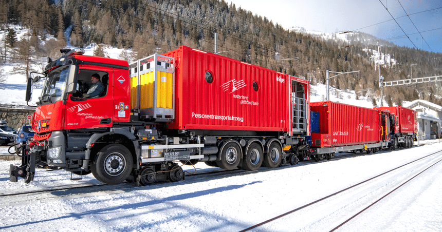 Voici un autre exemple de véhicule rail-route sorti des ateliers Hilton Kommunal. Réalisé cette fois sur base Mercedes Arocs 3242 LK 8×4, avec deux bogies ferroviaires, dont un dans l’empattement, il a été livré au réseau Matterhorn Gotthard Bahn, en Suisse, pour la sécurité incendie dans les tunnels. Quatre exemplaires y sont en service depuis 2019.