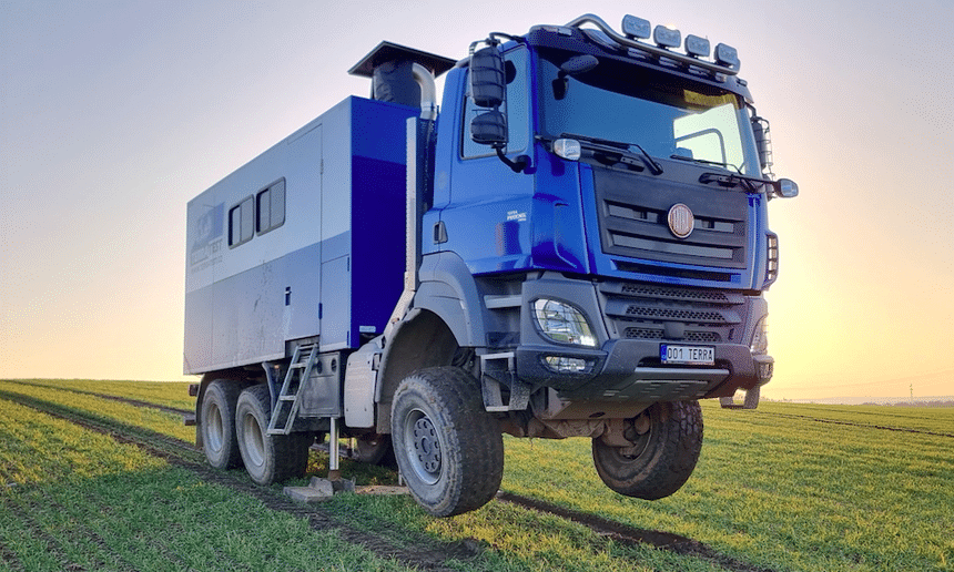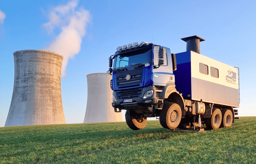 Ce Tatra Phoenix 6×6 est en effet utilisé par une entreprise tchèque pour réaliser des essais de pénétration statique. Il s’agit d’enfoncer verticalement dans le sol, sans choc, sans vibration, sans rotation et à vitesse constante, une pointe munie d’un cône en partie inférieure. Les paramètres ainsi recueillis permettent d’apprécier l’homogénéité ou la présence d’anomalie d’un sol, ainsi que ses caractéristiques.