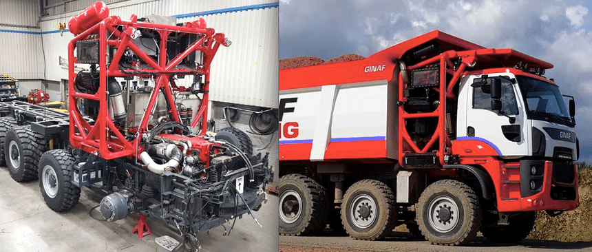 Côté mécanique, le Ginaf est entraîné par un diesel Cummins Tier 4 Final ou Tier 3 de 605 ch ou 610 ch, associé à une transmission automatisée ZF AS-Tronic totalisant 12 rapports avant. Quant à la cabine, contrairement aux autres productions de la marque, qui retiennent une cabine Daf, il s’agit ici d’une Ford, fabriquée en Turquie.