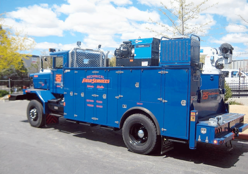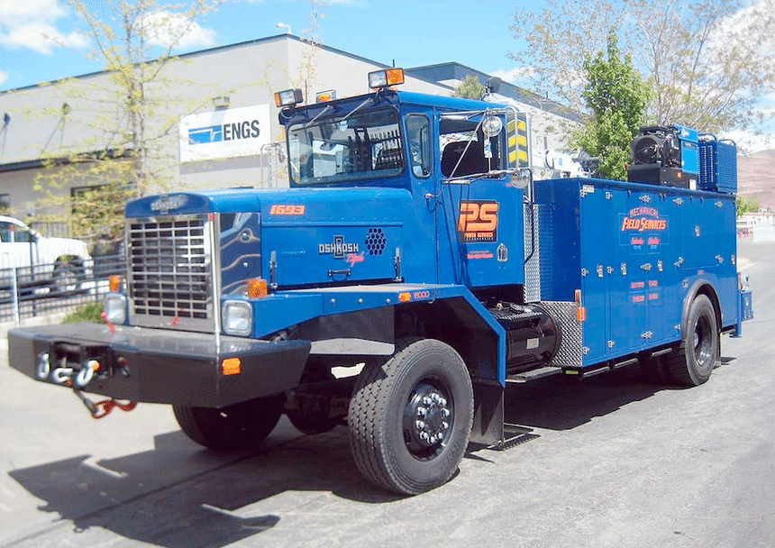 Les « service trucks » sont très courants en Amérique du Nord, il en existe de toutes sortes, du pick-up au 6×4. Celui-ci est doublement intéressant. D’abord parce qu’il s’agit d’un 4×4 de 18 t de PTC, ensuite parce qu’il s’agit d’un Oshkosh, rarement employé à cet usage.