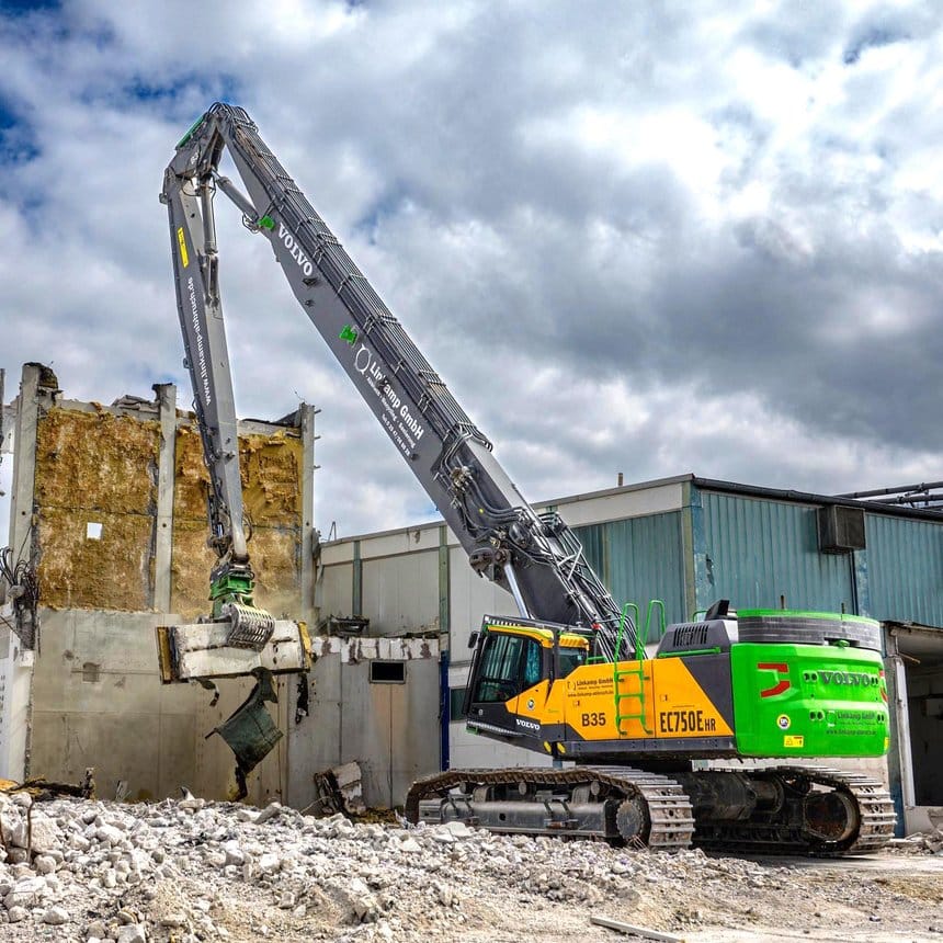 Une spécialité qui met en œuvre de grosses machines, en particulier des pelles hydrauliques dotées d’une flèche longue et robuste pour travailler en hauteur et porter des équipements lourds, tels que pince à béton, cisaille ou marteau hydraulique.