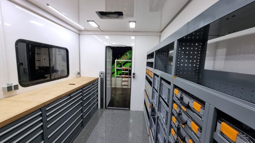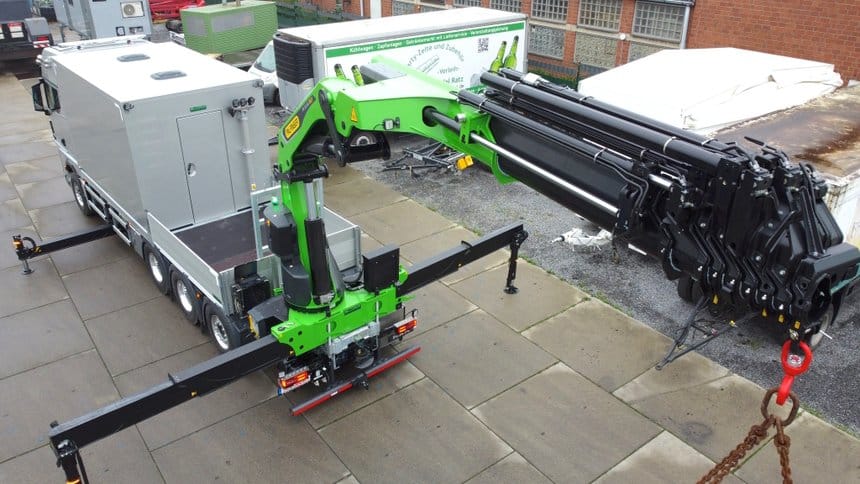 Ces machines, très sollicitées, nécessitent des interventions sur site pour leur maintenance, voire leur réparation. C’est pourquoi Linkamp Abbrucht s’est doté d’un camion de soutien technique particulièrement bien doté, avec notamment une grue repliable Palfinger PK 58.002 TEC 7 de 55,5 t.m, un générateur de 35 kVA, un compresseur de 12 bar, un mât d’éclairage, un fourgon atelier tout équipé et chauffé, etc.