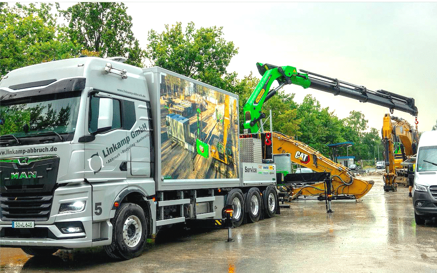 Ces machines, très sollicitées, nécessitent des interventions sur site pour leur maintenance, voire leur réparation. C’est pourquoi Linkamp Abbrucht s’est doté d’un camion de soutien technique particulièrement bien doté, avec notamment une grue repliable Palfinger PK 58.002 TEC 7 de 55,5 t.m, un générateur de 35 kVA, un compresseur de 12 bar, un mât d’éclairage, un fourgon atelier tout équipé et chauffé, etc.