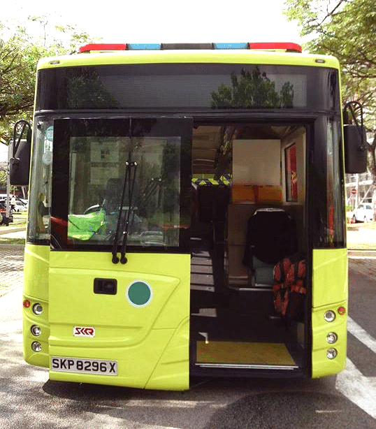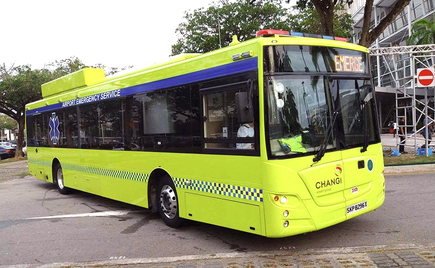 S’il présente les apparences d’un autobus (châssis, carrosserie), ce véhicule est en réalité une ambulance utilisée par les services de secours de l’aéroport de Changi, à Singapour.