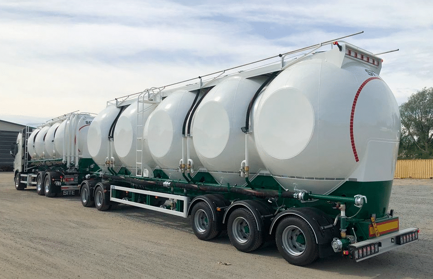 Et puis, classique dans le pays, le porteur-remorqueur se prête, lui aussi, particulièrement bien aux grandes capacités, donc aux grandes longueurs. Cet ensemble silo pour produits pulvérulents légers, signé SITE, admet 30 m3 sur le porteur et 57 m3 sur la remorque.